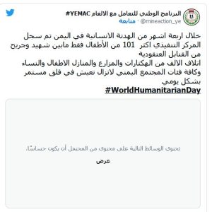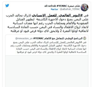 وكان مدير المركز التنفيذي للتعامل مع الألغام في صنعاء العميد صفرة أكد في تغريده له على منصة “تويتر” بمناسبة اليوم العالمي للعمل الإنساني ، أن تحالف الحرب على اليمن لا يزال يمنع دخول الاجهزة الكاشفة لتطهير القنابل العنقودية والالغام ومخلفات الحرب رغم انها معدات انسانية لإنقاذ ارواح الاطفال والنساء في اليمن حسب المادة السادسة لاتفاقية اوتاوا الفقرة 2 ولا يحق لأي دولة فرض قيود او عرقلته.