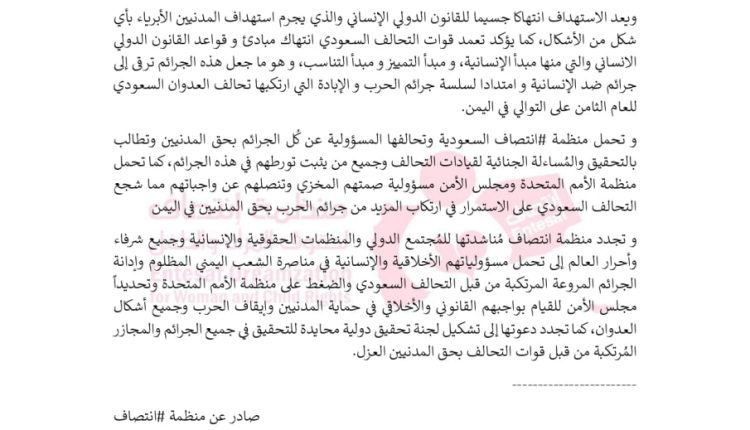 بيان إدانة منظمة #انتصاف بشأن استمرار جرائم دول تحالف العدوان السعودي و مرتزقتة بحق الاطفال في محافظة #الحديدة