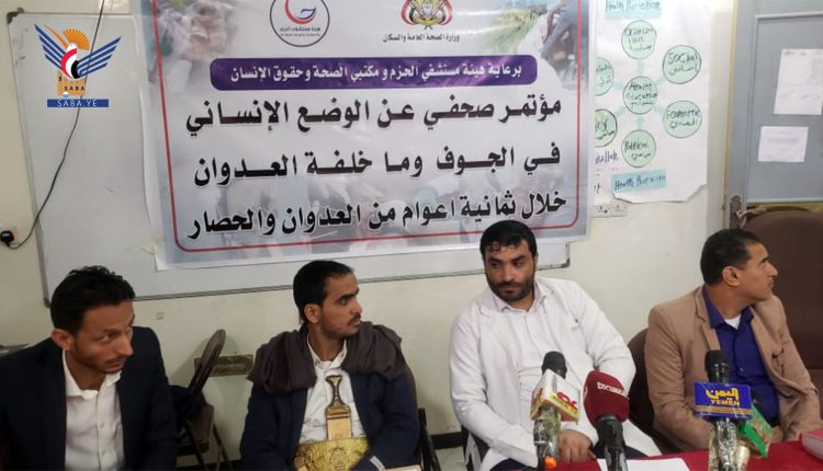 عقدت هيئة مستشفى الحزم ومكتبا الصحة وحقوق الإنسان في الجوف، اليوم، مؤتمرا صحفيا عن الوضع الإنساني في المحافظة.