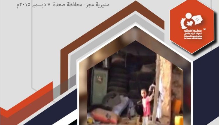 أصدرت منظمة انتصاف لحقوق المرأة والطفل تقريراً حقوقياً بعنوان”غارات ليلية” حيث تناول التقرير الجريمة التي ارتكبها طيران تحالف العدوان على منازل المدنيين بمنطقة ضحيان التابعة لمدیریة مجز بمحافظة صعدة والتي را ح ضحيتها مدنيين بينهم نساء و أطفال، وذلك بتاريخ 7 ديسمبر 2015م