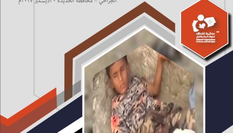 أصدرت منظمة انتصاف لحقوق المرأة والطفل تقريراً حقوقياً بعنوان”شظايا عشوائية” حيث تناول التقرير الجريمة التي ارتكبها طيران تحالف العدوان على سوق شعبي بمنطقة الجراحي التابعة لمدیریة الجراحي بمحافظة الحديدة والتي را ح ضحيتها مدنيين بينهم نساء و أطفال، وذلك بتاريخ 30 ديسمبر 2017م