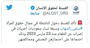 وقال المنظمة عبر حسابها في “تويتر”: “تأكد للقسط دخول الناشطة في مجال حقوق المرأة سلمى الشهاب و7 نساء سعوديات أخريات في إضراب عن الطعام منذ 23 مارس 2023 وذلك احتجاجًا على احتجازهن التعسفي ومحاكمتهن الصورية”.