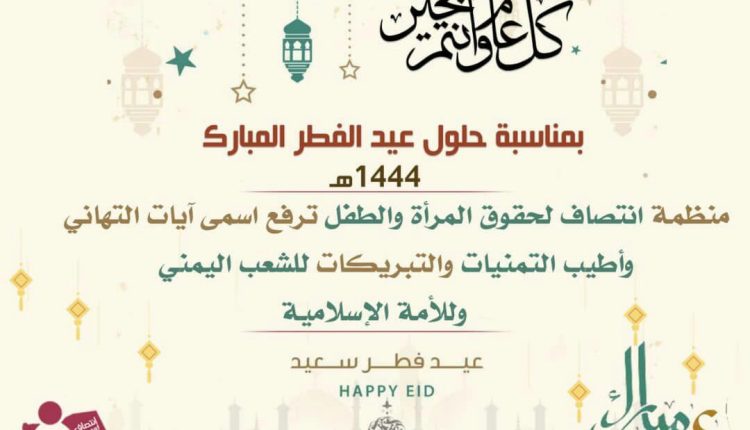 #منظمة انتصاف لحقوق المرأة و الطفل ترفع آيات التهاني وأطيب التمنيات و التبريكات للشعب اليمني و للأمة الإسلامية بمناسبة حلول عيد الفطر المبارك 1444 هجرية كل عام وانتم بخير