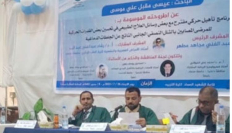 نال الباحث عيسى مقبل علي موسى درجة الدكتوراه بامتياز من كلية التربية الرياضية بجامعة صنعاء عن أطروحته الموسومة بــ” أثر برنامج تأهيل حركي مقترح مع بعض وسائل العلاج الطبيعي في تحسين بعض القدرات الحركية للمرضى المصابين بالشلل النصفي الجانبي الناتج عن الجلطات الدماغية “.
