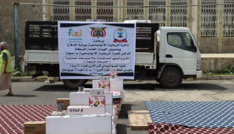 دشنت شعبة الرعاية الاجتماعية في حجة ومكتب الهيئة العامة للزكاة بالمحافظة اليوم المرحلة الرابعة من مشروع توزيع المستلزمات والاحتياجات المنزلية لأسر الاسرى والمفقودين والجرحى والمعاقين.