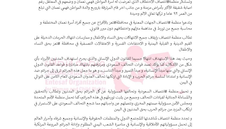 تطالب منظمة انتصاف بايقاف جميع الانتهاكات بحق النساء والاطفال و ممارسات انتهاك الحرمات الدخيلة على القيم الدينية و القبلية اليمنية و الاختفاءات القسرية و الاعتقالات التعسفية في محافظة #تعز بحق النساء والاطفال