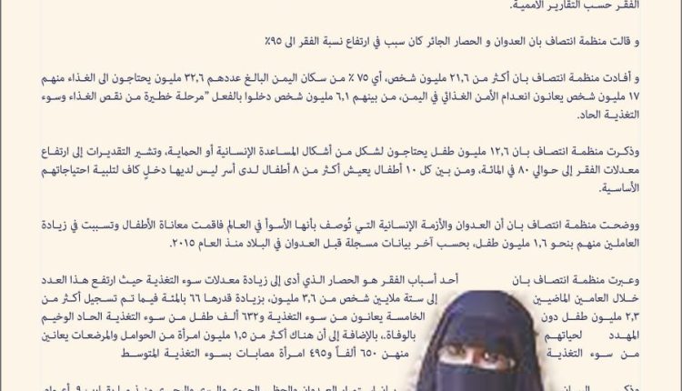 و قالت منظمة انتصاف بان العدوان و الحصار الجائر كان سبب في ارتفاع نسبة الفقر الى 95%