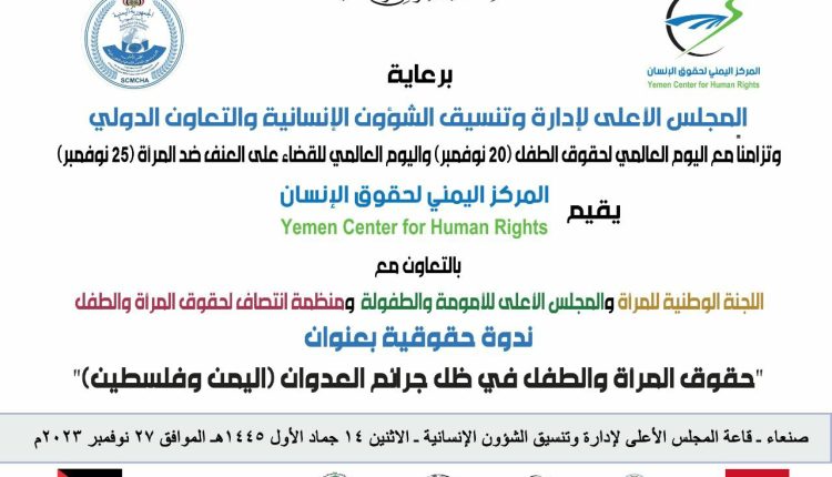 تزامنا مع اليوم العالمي لحقوق الطفل ٢٠نوفمبر واليوم العالمي للقضاء على العنف ضد المرأه ٢٥نوفمبر….. يقيم المركز اليمني لحقوق الإنسان وبالتعاون مع اللجنه الوطنيه للمرأه والمجلس الأعلى للأمومه والطفوله ومنظمة انتصاف لحقوق المرأة والطفل ندوة حقوقية بعنوان “حقوق المرأة والطفل في ظل جرائم العدوان (اليمن وفلسطين).