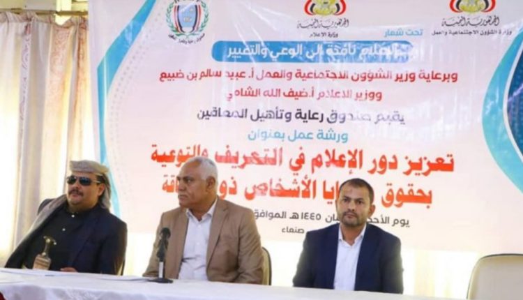 برعاية وزير الشؤون الاجتماعية والعمل عبيد سالم بن ضبيع، ووزير الإعلام ضيف الله الشامي، تظم صندوق رعاية وتأهيل المعاقين اليوم بصنعاء، ورشة العمل الخاصة بتعزيز دور الإعلام في التعريف والتوعية بحقوق وقضايا الأشخاص ذوي الإعاقة.
