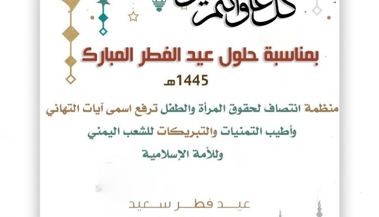#منظمة انتصاف لحقوق المرأة و الطفل ترفع اسمى آيات التهاني وأطيب التمنيات و التبريكات للشعب اليمني و للأمة الإسلامية بمناسبة حلول عيد الفطر المبارك 1445 هجرية