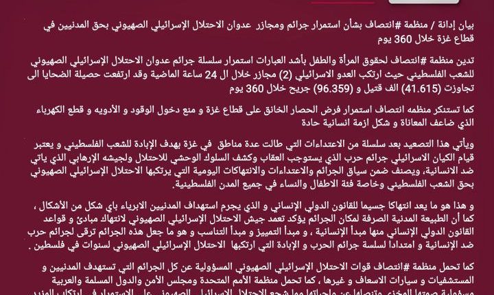 بيان إدانة / منظمة #انتصاف بشأن استمرار جرائم ومجازر عدوان الاحتلال الإسرائيلي الصهيوني بحق المدنيين في قطاع غزة خلال 360 يوم