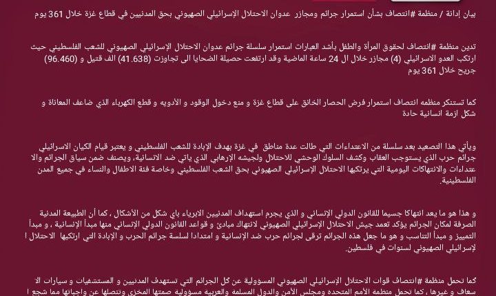 بيان إدانة / منظمة #انتصاف بشأن استمرار جرائم ومجازر عدوان الاحتلال الإسرائيلي الصهيوني بحق المدنيين في قطاع غزة خلال 361 يوم