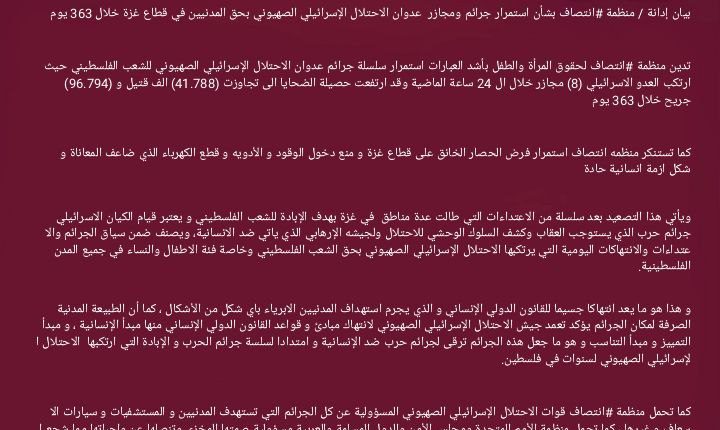 بيان إدانة / منظمة #انتصاف بشأن استمرار جرائم ومجازر عدوان الاحتلال الإسرائيلي الصهيوني بحق المدنيين في قطاع غزة خلال 363 يوم