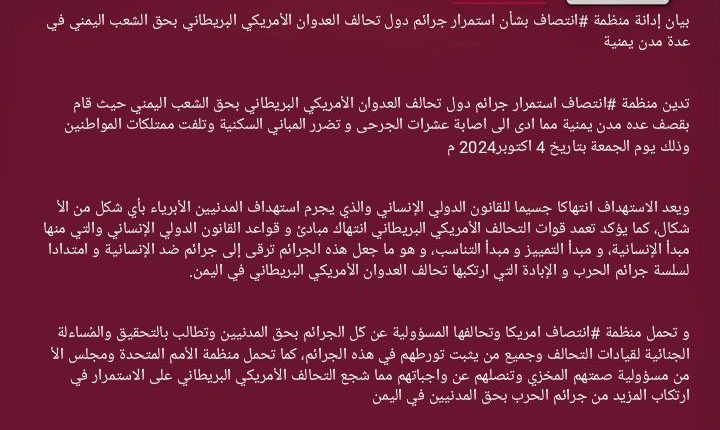 تدين منظمة #انتصاف استمرار جرائم دول تحالف العدوان الأمريكي البريطاني بحق الشعب اليمني حيث قام بقصف عده مدن يمنية مما ادى الى اصابة عشرات الجرحى و تضرر المباني السكنية وتلفت ممتلكات المواطنين وذلك يوم الجمعة بتاريخ 4 اكتوبر 2024م