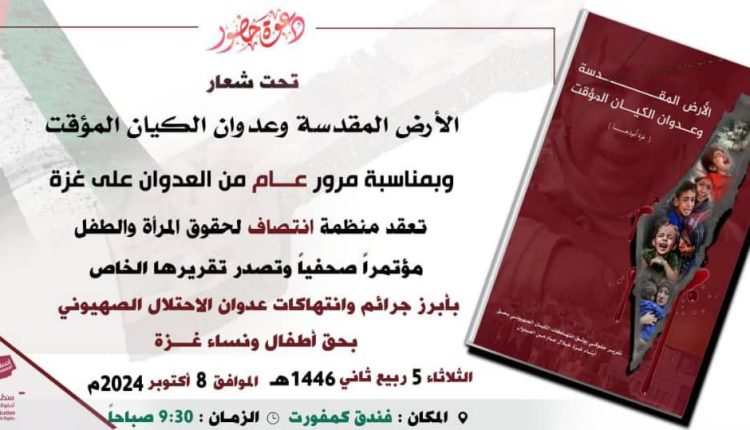 بمناسبة مرور عام من العدوان على غزة تعقد #منظمة_انتصاف لحقوق المرأة والطفل مؤتمراًصحفياً وتصدر تقريرها الخاص بأبرز جرائم وانتهاكات عدوان الاحتلال الصهيوني بحق أطفال و نساء غزة