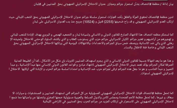 كما تستنكر منظمه انتصاف هذا الانتهاك الصارخ للقانون الدولي و الانساني ولسيادة لبنان و التصعيد الهمجي و البربري بهدف الإبادة للشعب للبناني و تهجيرهم من أراضيهم و تعتبر جرائم الكيان الاسرائيلي جرائم حرب الذي يستوجب العقاب و الذي يكشف السلوك الوحشي للاحتلال ولجيشه الإرهابي الذي ياتي ضد الانسانية، ويصنف ضمن سياق الجرائم والاعتداءات والانتهاكات اليومية التي يرتكبها الاحتلال الإسرائيلي الصهيوني بحق الشعب اللبناني وخاصة فئة الاطفال والنساء.