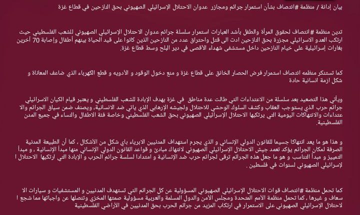 بيان إدانة / منظمة #انتصاف بشأن استمرار جرائم ومجازر عدوان الاحتلال الإسرائيلي الصهيوني بحق النازحين في قطاع غزة