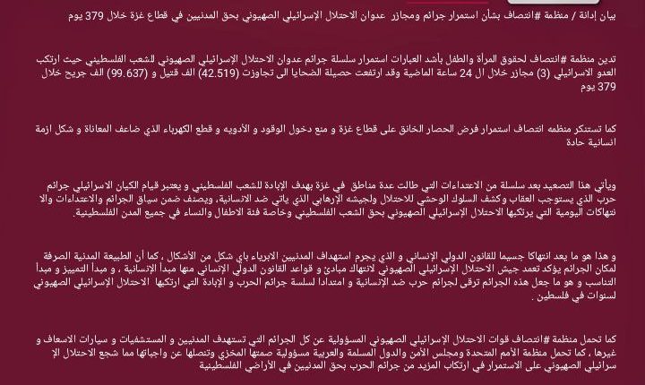 بيان إدانة / منظمة #انتصاف بشأن استمرار جرائم ومجازر عدوان الاحتلال الإسرائيلي الصهيوني بحق المدنيين في قطاع غزة خلال 379 يوم