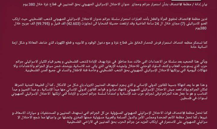 بيان إدانة / منظمة #انتصاف بشأن استمرار جرائم ومجازر عدوان الاحتلال الإسرائيلي الصهيوني بحق المدنيين في قطاع غزة خلال 380 يوم