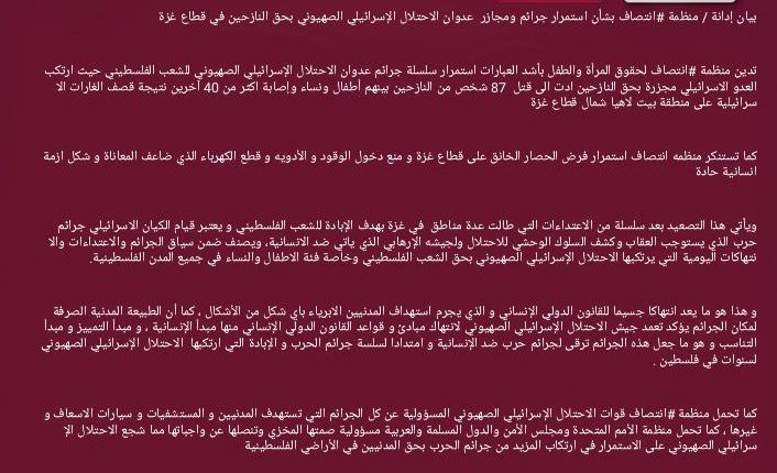 بيان إدانة / منظمة #انتصاف بشأن استمرار جرائم ومجازر عدوان الاحتلال الإسرائيلي الصهيوني بحق النازحين في قطاع غزة