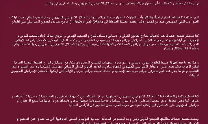 كما تستنكر منظمه انتصاف هذا الانتهاك الصارخ للقانون الدولي و الانساني ولسيادة لبنان و التصعيد الهمجي و البربري بهدف الإبادة للشعب للبناني و تهجيرهم من أراضيهم و تعتبر جرائم الكيان الاسرائيلي جرائم حرب الذي يستوجب العقاب و الذي يكشف السلوك الوحشي للاحتلال ولجيشه الإرهابي الذي ياتي ضد الانسانية، ويصنف ضمن سياق الجرائم والاعتداءات والانتهاكات اليومية التي يرتكبها الاحتلال الإسرائيلي الصهيوني بحق الشعب اللبناني وخاصة فئة الاطفال والنساء.