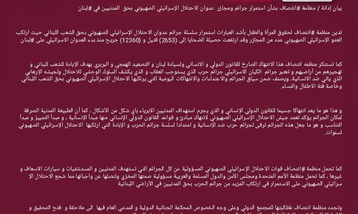 بيان إدانة / منظمة #انتصاف بشأن استمرار جرائم ومجازر عدوان الاحتلال الإسرائيلي الصهيوني بحق المدنيين في #لبنان