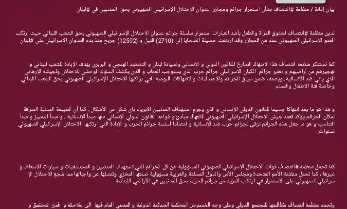 بيان إدانة / منظمة #انتصاف بشأن استمرار جرائم ومجازر عدوان الاحتلال الإسرائيلي الصهيوني بحق المدنيين في #لبنان