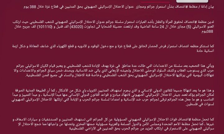 بيان إدانة / منظمة #انتصاف بشأن استمرار جرائم ومجازر عدوان الاحتلال الإسرائيلي الصهيوني بحق المدنيين في قطاع غزة خلال 388 يوم