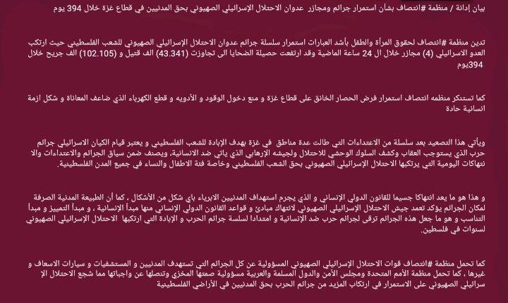بيان إدانة / منظمة #انتصاف بشأن استمرار جرائم ومجازر عدوان الاحتلال الإسرائيلي الصهيوني بحق المدنيين في قطاع غزة خلال 394 يوم