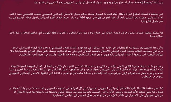 بيان إدانة / منظمة #انتصاف بشأن استمرار جرائم ومجازر عدوان الاحتلال الإسرائيلي الصهيوني بحق المدنيين في قطاع غزة