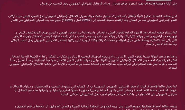 بيان إدانة / منظمة #انتصاف بشأن استمرار جرائم ومجازر عدوان الاحتلال الإسرائيلي الصهيوني بحق المدنيين في #لبنان