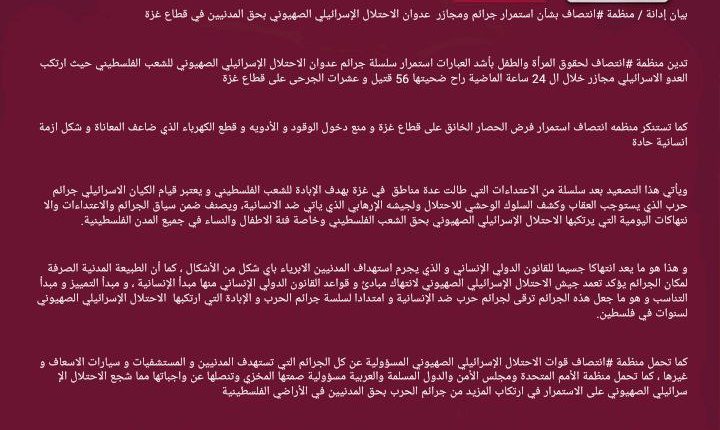 تدين منظمة #انتصاف لحقوق المرأة والطفل بأشد العبارات استمرار سلسلة جرائم عدوان الاحتلال الإسرائيلي الصهيوني للشعب الفلسطيني حيث ارتكب العدو الاسرائيلي مجازر خلال ال 24 ساعة الماضية راح ضحيتها 56 قتيل و عشرات الجرحى على قطاع غزة