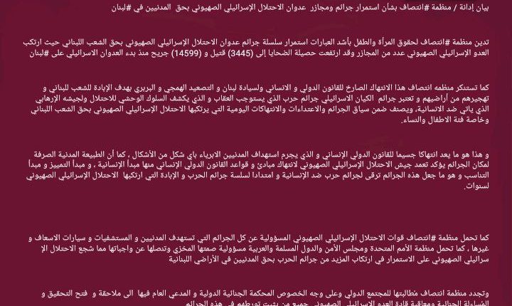 كما تستنكر منظمه انتصاف هذا الانتهاك الصارخ للقانون الدولي و الانساني ولسيادة لبنان و التصعيد الهمجي و البربري بهدف الإبادة للشعب للبناني و تهجيرهم من أراضيهم و تعتبر جرائم الكيان الاسرائيلي جرائم حرب الذي يستوجب العقاب و الذي يكشف السلوك الوحشي للاحتلال ولجيشه الإرهابي الذي ياتي ضد الانسانية، ويصنف ضمن سياق الجرائم والاعتداءات والانتهاكات اليومية التي يرتكبها الاحتلال الإسرائيلي الصهيوني بحق الشعب اللبناني وخاصة فئة الاطفال والنساء.