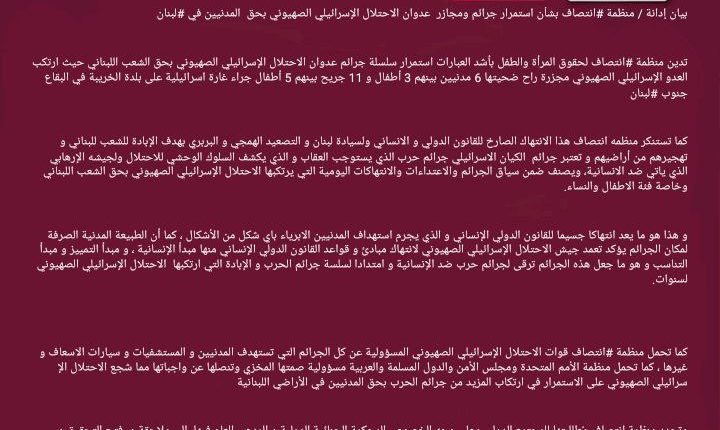 بيان إدانة / منظمة #انتصاف بشأن استمرار جرائم ومجازر عدوان الاحتلال الإسرائيلي الصهيوني بحق المدنيين في #لبنان