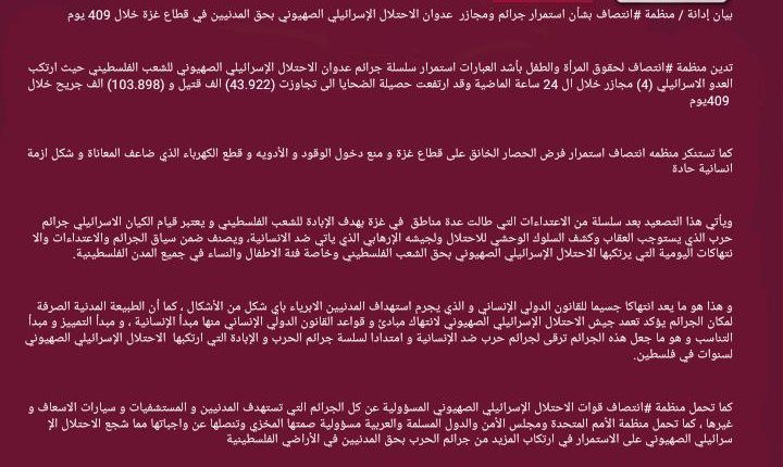 بيان إدانة / منظمة #انتصاف بشأن استمرار جرائم ومجازر عدوان الاحتلال الإسرائيلي الصهيوني بحق المدنيين في قطاع غزة خلال 409 يوم