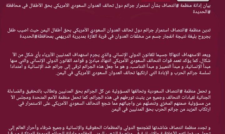 بيان إدانة منظمة #انتصاف بشأن استمرار جرائم دول تحالف العدوان السعودي الأمريكي بحق الأطفال في محافظة #الحديدة