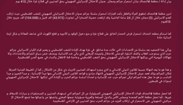 بيان إدانة / منظمة #انتصاف بشأن استمرار جرائم ومجازر عدوان الاحتلال الإسرائيلي الصهيوني بحق المدنيين في قطاع غزة خلال 410 يوم