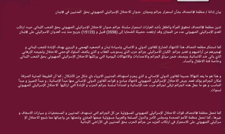 كما تستنكر منظمه انتصاف هذا الانتهاك الصارخ للقانون الدولي و الانساني ولسيادة لبنان و التصعيد الهمجي و البربري بهدف الإبادة للشعب للبناني و تهجيرهم من أراضيهم و تعتبر جرائم الكيان الاسرائيلي جرائم حرب الذي يستوجب العقاب و الذي يكشف السلوك الوحشي للاحتلال ولجيشه الإرهابي الذي ياتي ضد الانسانية، ويصنف ضمن سياق الجرائم والاعتداءات والانتهاكات اليومية التي يرتكبها الاحتلال الإسرائيلي الصهيوني بحق الشعب اللبناني وخاصة فئة الاطفال والنساء.