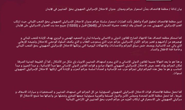 كما تستنكر منظمه انتصاف هذا الانتهاك الصارخ للقانون الدولي و الانساني ولسيادة لبنان و التصعيد الهمجي و البربري بهدف الإبادة للشعب للبناني و تهجيرهم من أراضيهم و تعتبر جرائم الكيان الاسرائيلي جرائم حرب الذي يستوجب العقاب و الذي يكشف السلوك الوحشي للاحتلال ولجيشه الإرهابي الذي ياتي ضد الانسانية، ويصنف ضمن سياق الجرائم والاعتداءات والانتهاكات اليومية التي يرتكبها الاحتلال الإسرائيلي الصهيوني بحق الشعب اللبناني وخاصة فئة الاطفال والنساء.