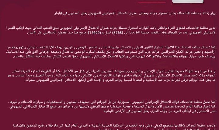 بيان إدانة / منظمة #انتصاف بشأن استمرار جرائم ومجازر عدوان الاحتلال الإسرائيلي الصهيوني بحق المدنيين في #لبنان