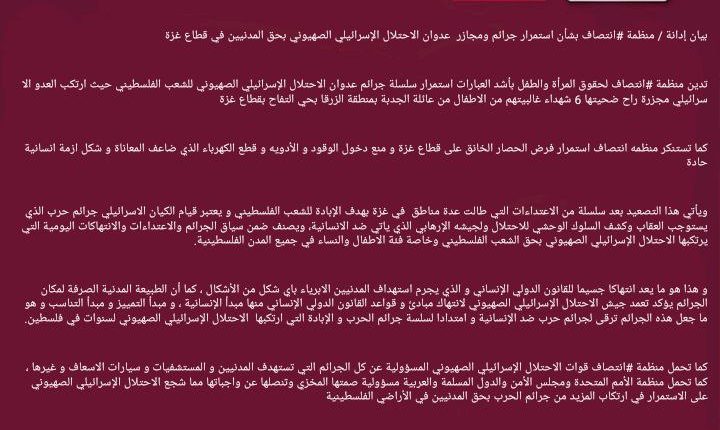 بيان إدانة / منظمة #انتصاف بشأن استمرار جرائم ومجازر عدوان الاحتلال الإسرائيلي الصهيوني بحق المدنيين في قطاع غزة