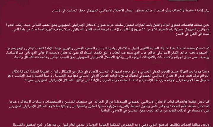 بيان إدانة / منظمة #انتصاف بشأن استمرار جرائم ومجازر عدوان الاحتلال الإسرائيلي الصهيوني بحق المدنيين في #لبنان