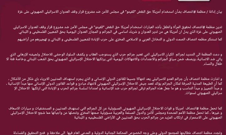 بيان إدانة / منظمة #انتصاف بشأن استخدام أمريكا حق النقض “للفيتو” في مجلس الأمن ضد مشروع قرار وقف العدوان الاسرائيلي الصهيوني على غزة