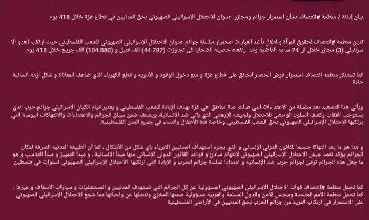 بيان إدانة / منظمة #انتصاف بشأن استمرار جرائم ومجازر عدوان الاحتلال الإسرائيلي الصهيوني بحق المدنيين في قطاع غزة
