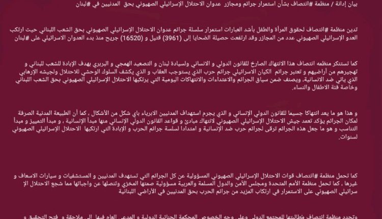 كما تستنكر منظمه انتصاف هذا الانتهاك الصارخ للقانون الدولي و الانساني ولسيادة لبنان و التصعيد الهمجي و البربري بهدف الإبادة للشعب للبناني و تهجيرهم من أراضيهم و تعتبر جرائم الكيان الاسرائيلي جرائم حرب الذي يستوجب العقاب و الذي يكشف السلوك الوحشي للاحتلال ولجيشه الإرهابي الذي ياتي ضد الانسانية، ويصنف ضمن سياق الجرائم والاعتداءات والانتهاكات اليومية التي يرتكبها الاحتلال الإسرائيلي الصهيوني بحق الشعب اللبناني وخاصة فئة الاطفال والنساء.