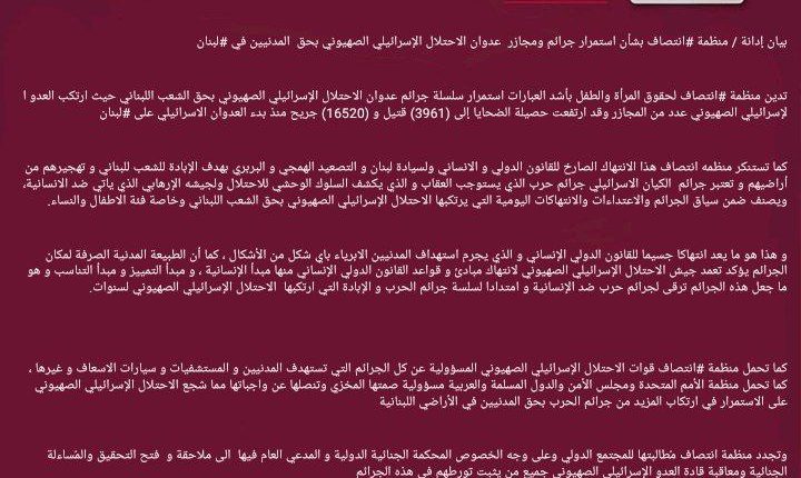 كما تستنكر منظمه انتصاف هذا الانتهاك الصارخ للقانون الدولي و الانساني ولسيادة لبنان و التصعيد الهمجي و البربري بهدف الإبادة للشعب للبناني و تهجيرهم من أراضيهم و تعتبر جرائم الكيان الاسرائيلي جرائم حرب الذي يستوجب العقاب و الذي يكشف السلوك الوحشي للاحتلال ولجيشه الإرهابي الذي ياتي ضد الانسانية، ويصنف ضمن سياق الجرائم والاعتداءات والانتهاكات اليومية التي يرتكبها الاحتلال الإسرائيلي الصهيوني بحق الشعب اللبناني وخاصة فئة الاطفال والنساء.