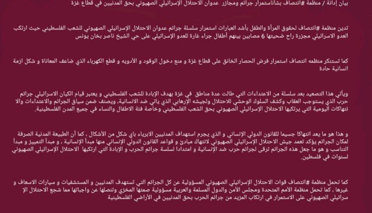 بيان إدانة / منظمة #انتصاف بشأناستمرار جرائم ومجازر عدوان الاحتلال الإسرائيلي الصهيوني بحق المدنيين في قطاع غزة