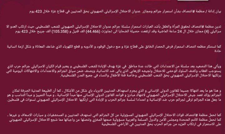 بيان إدانة / منظمة #انتصاف بشأن استمرار جرائم ومجازر عدوان الاحتلال الإسرائيلي الصهيوني بحق المدنيين في قطاع غزة خلال 423 يوم