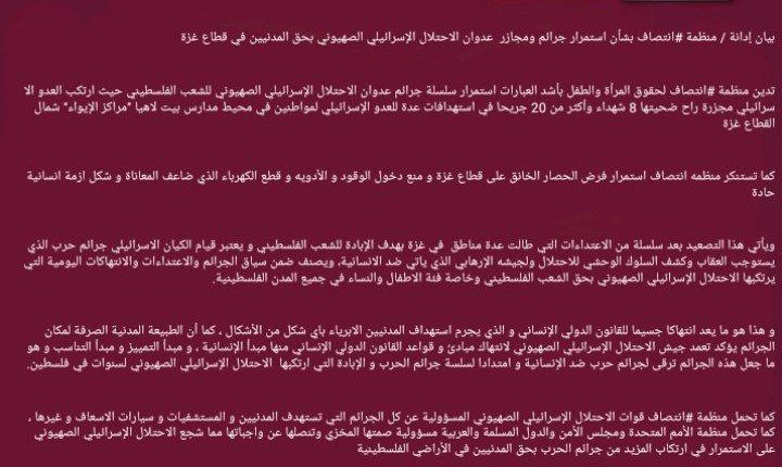 بيان إدانة / منظمة #انتصاف بشأن استمرار جرائم ومجازر عدوان الاحتلال الإسرائيلي الصهيوني بحق المدنيين في قطاع غزة