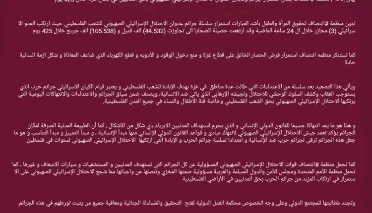 بيان إدانة / منظمة #انتصاف بشأن استمرار جرائم ومجازر  عدوان الاحتلال الإسرائيلي الصهيوني بحق المدنيين في قطاع غزة خلال 425 يوم
